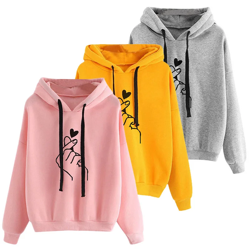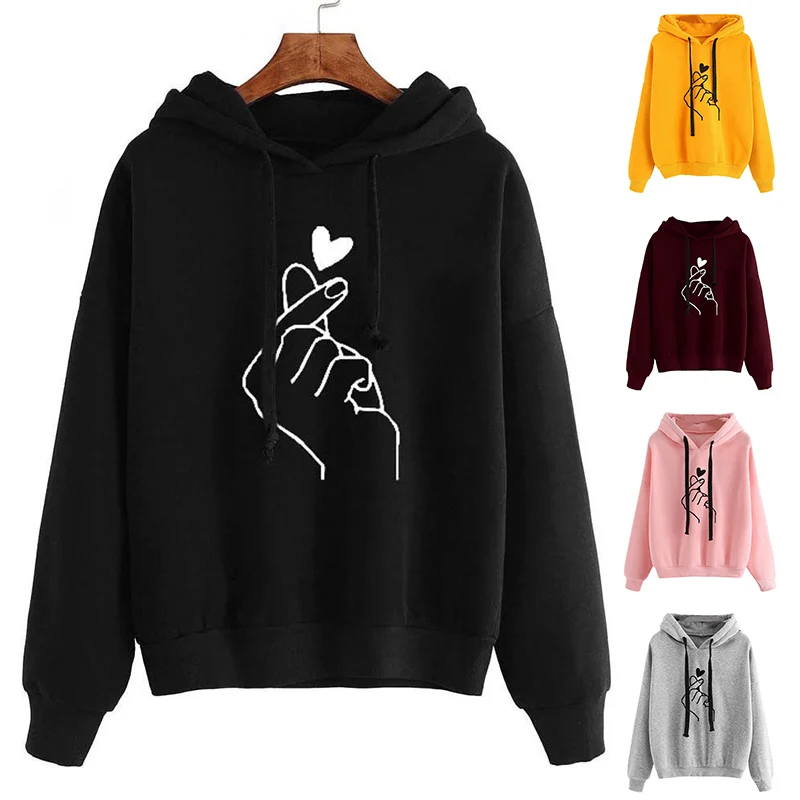 Best Casual Finger Heart Love Pattern Hooded Sweatshirts Women Hoodies Fashion Drawstring Long Sleeve Fe