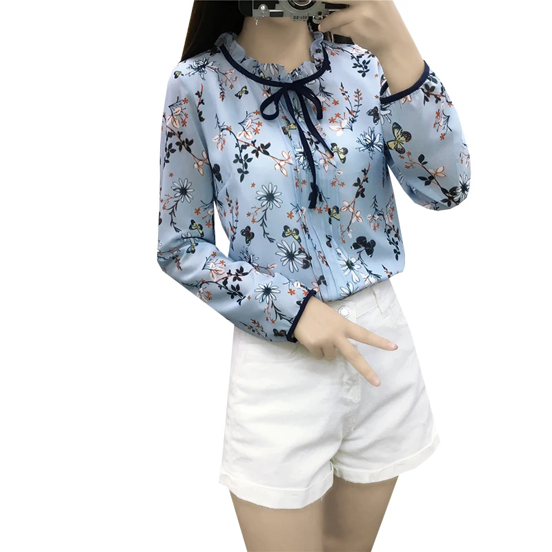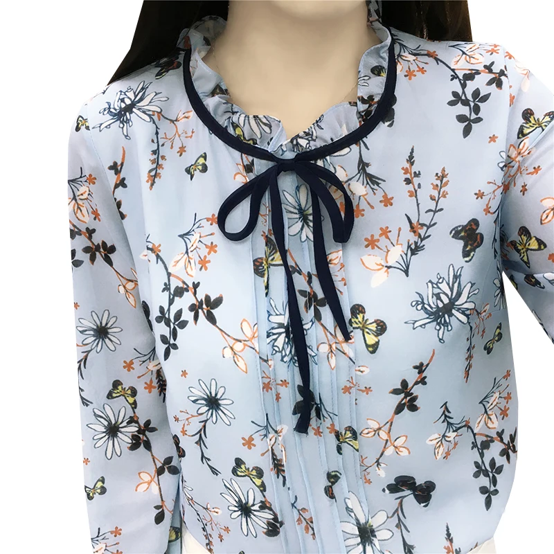 Promo 2017 New Summer Autumn Floral Print Chiffon Blouse Shirts Women Casual Loose Lace Up Tops Elegant S