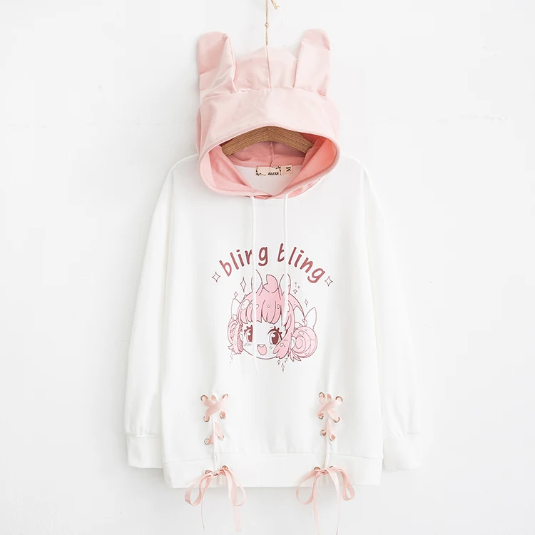 Buy Kawaii Ear Women Hooded Hoodies 2019 Spring Long Sleeve Lovely Pink Lolita Cute Girls Lace Up Cross