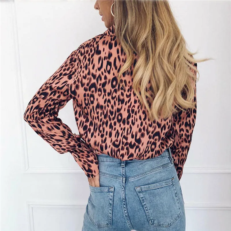 New Sexy Pink Animal Leopard Printed Women Blouse Long Sleeve Loose Shirt Tops V Neck Elegant Chemise F