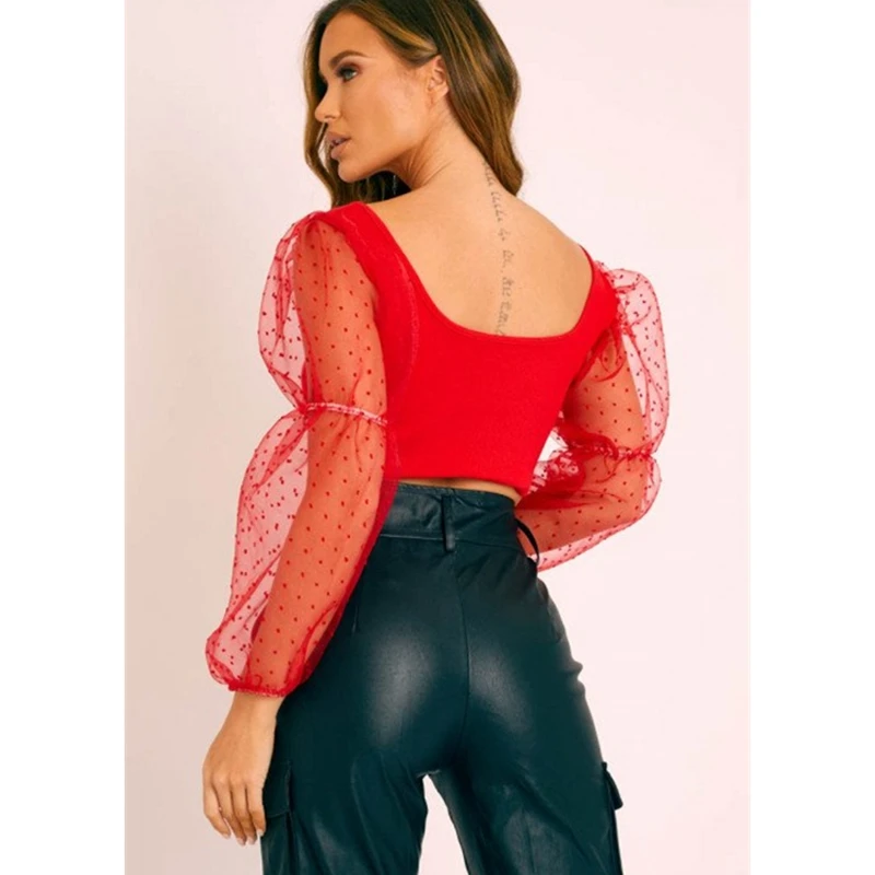 New Sexy Women Lace See-through Sheer Mesh Polka Dot Puff Long Sleeve O neck Crop Top Blouse Slim Club