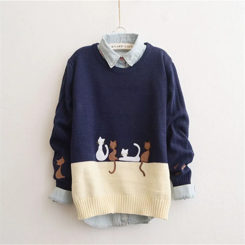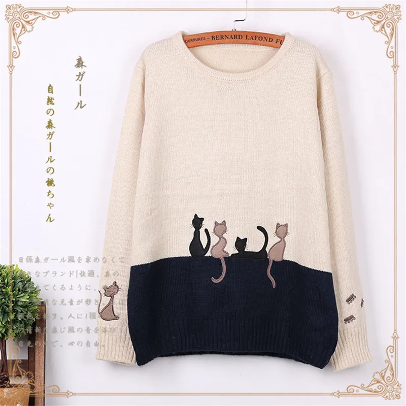 Best 2019 New Women Sweater Autumn & Winter The Cartoon Cat Small Embroidery Knit Sweater Women Round Ne